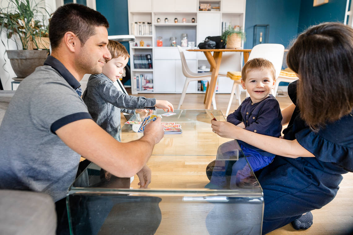 Pourquoi ne pas commencer la séance photo par un jeu de société. Ici, c’est le Uno qui a fait l’unanimité. Même si les enfants peuvent être de mauvais perdants et bouder, cela fait partie de leur personnalité et des mimiques que j’adore prendre en photo. Les parents aussi trouvent ça trop attendrissant de les voir bouder. Ca leur fera un bon souvenir !