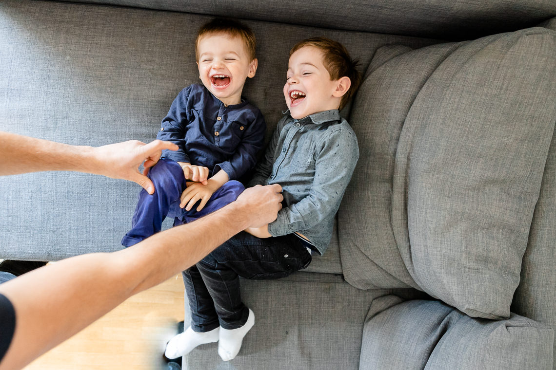 Pour augmenter le dynamisme des photos, je propose de vous installer confortablement sur votre canapé puis… de surprendre vos enfants en les chatouillant. Là encore, il y a des enfants qui vont rigoler et d’autres qui ne vont pas apprécier. On ne forcera donc pas le destin si un des enfants rechigne. Il pourra par contre faire des chatouilles à ses parents pour se venger !