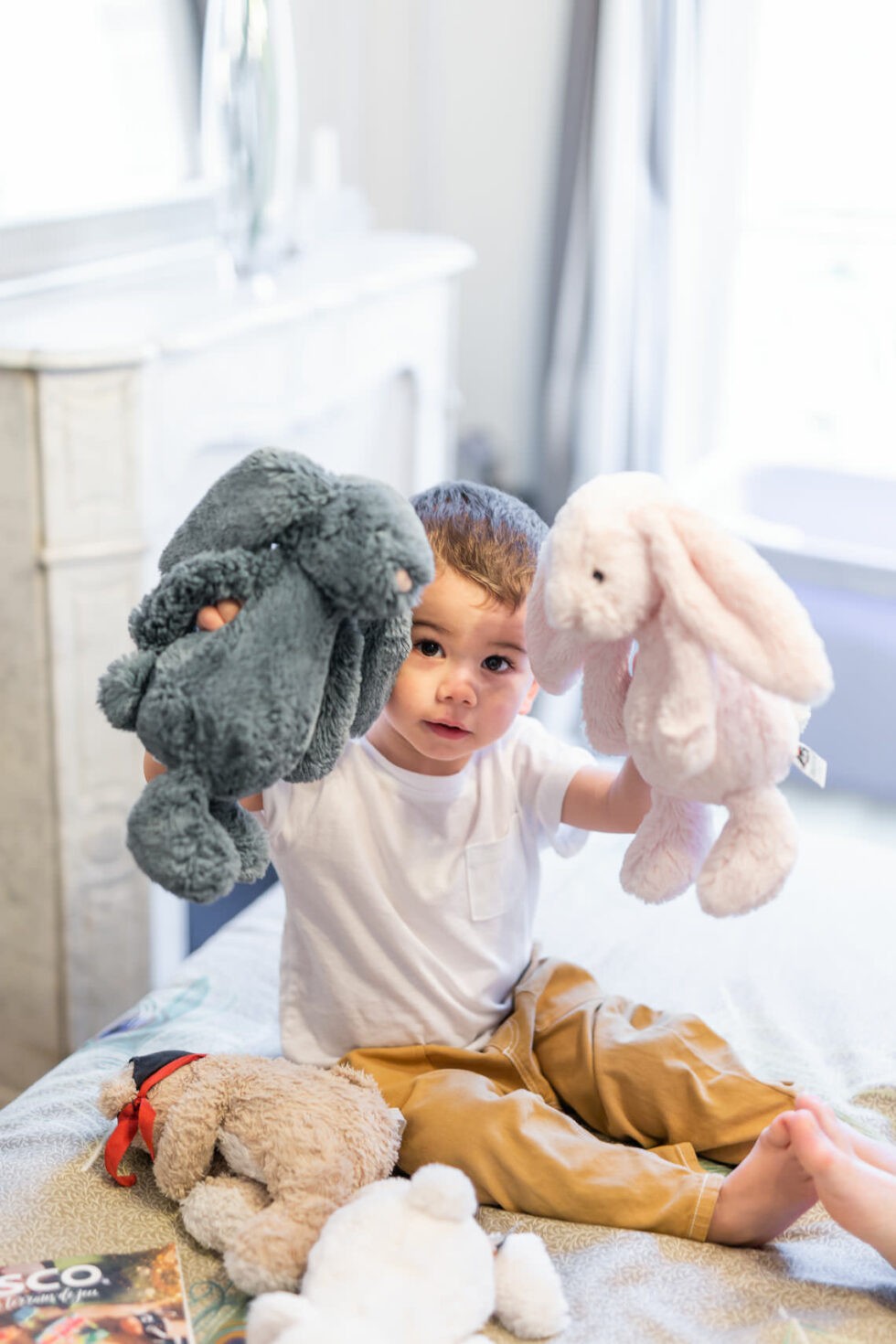 Profitez-en pour lui expliquer comment la séance va se passer : « On fera des photos dans le salon, sûrement sur le canapé comme quand on regarde la télé. On ira aussi dans la chambre de bébé et sur le lit de papa et maman. On fera des photos de bébé seul mais aussi avec toi, papa et maman.