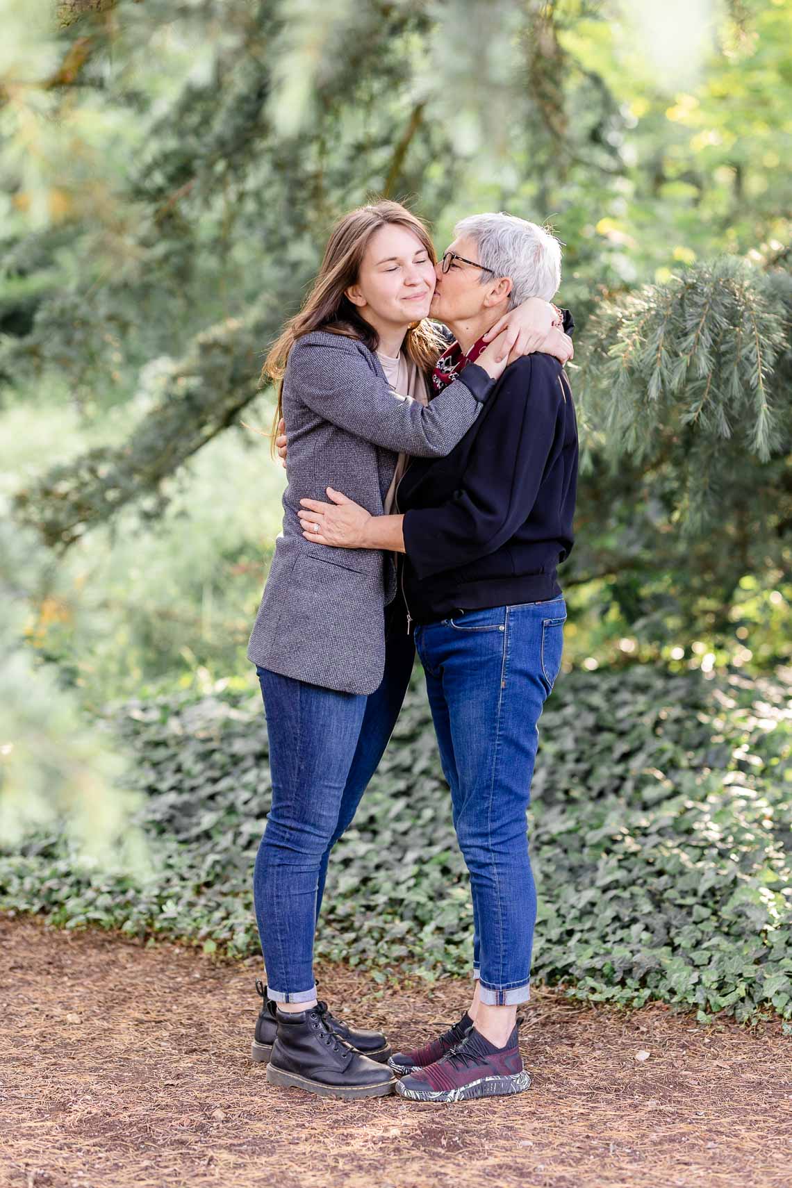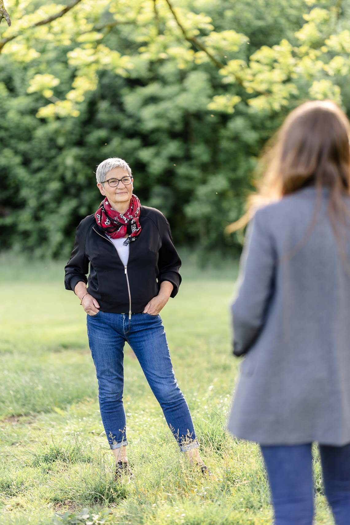 Dans ce premier exemple, j’ai placé la mère à l’arrière, derrière sa fille. Et je lui ai demandé de l’enlacé autour du cou. Elle a naturellement embrassé sa fille sur la joue, provoquant un superbe sourire ! C’est ça qui est magnifique dans le posing à ma façon. Un placement entraine toujours une réaction. C’est ce que je cherche dans mes photos et c’est grâce à ça qu’elles paraissent naturelles. C’est tout juste un peu guidé mais pas trop.