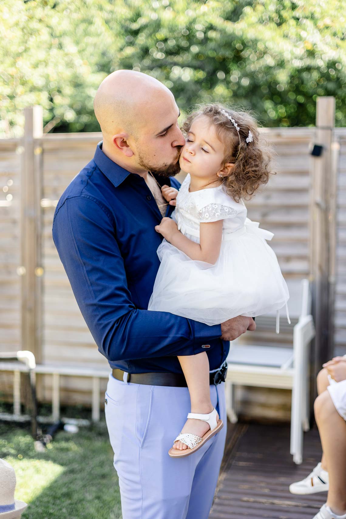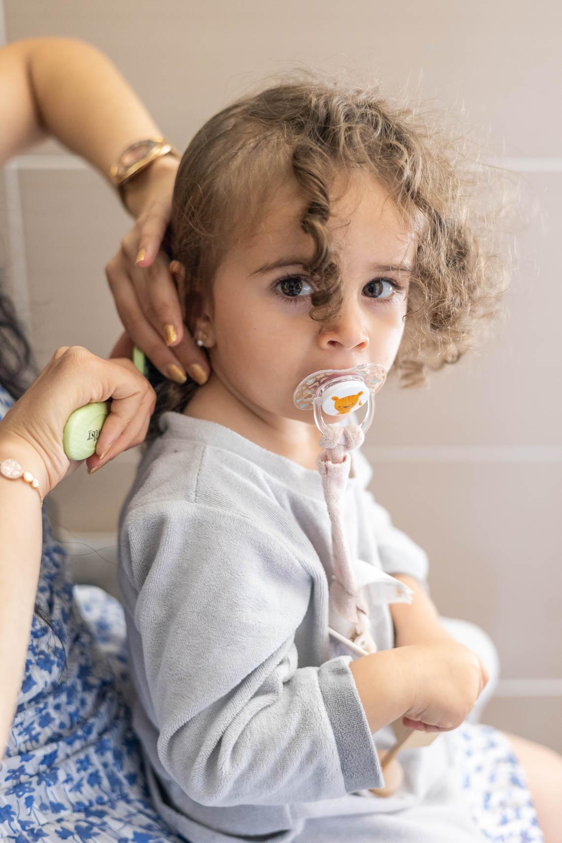 C’est au domicile de Catia que j’ai commencé ma prestation de photographe de baptême à Lieusaint. J’aime quand ma prestation démarre lors des préparatifs. Je prends en photo l’habillage et le coiffage des enfants. Tous les éléments du baptême sont réunis : cierge, coquillage pour l’eau, livret, robe et tenue de baptême…
