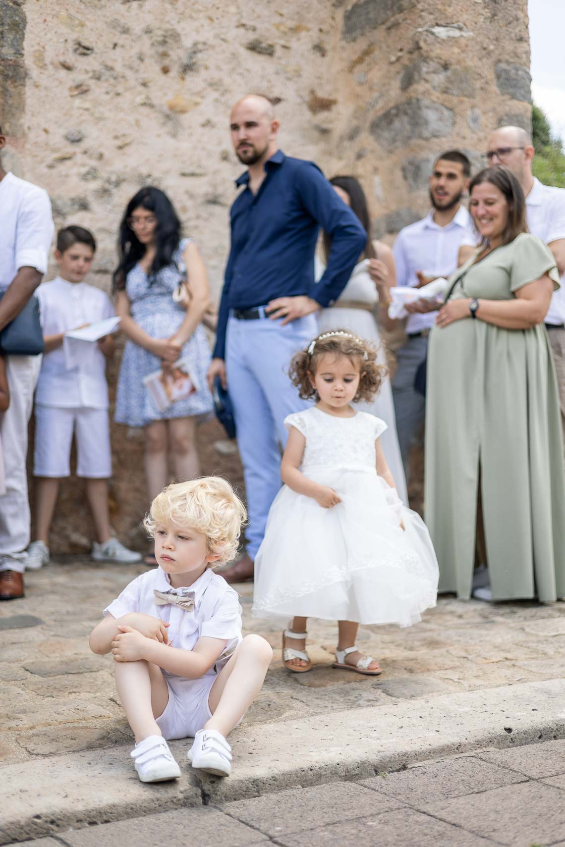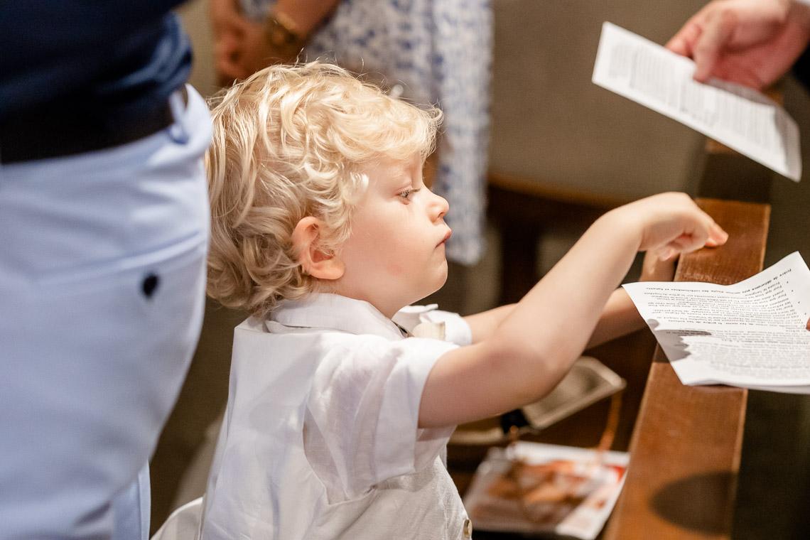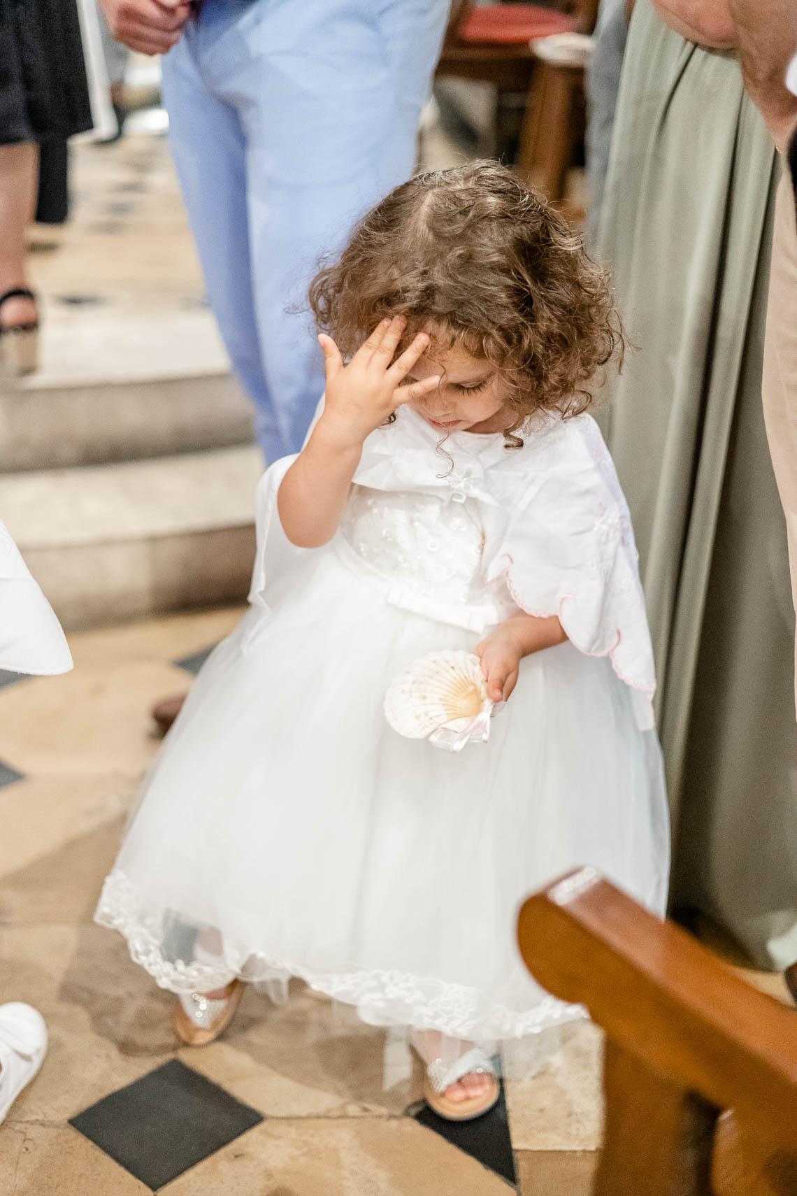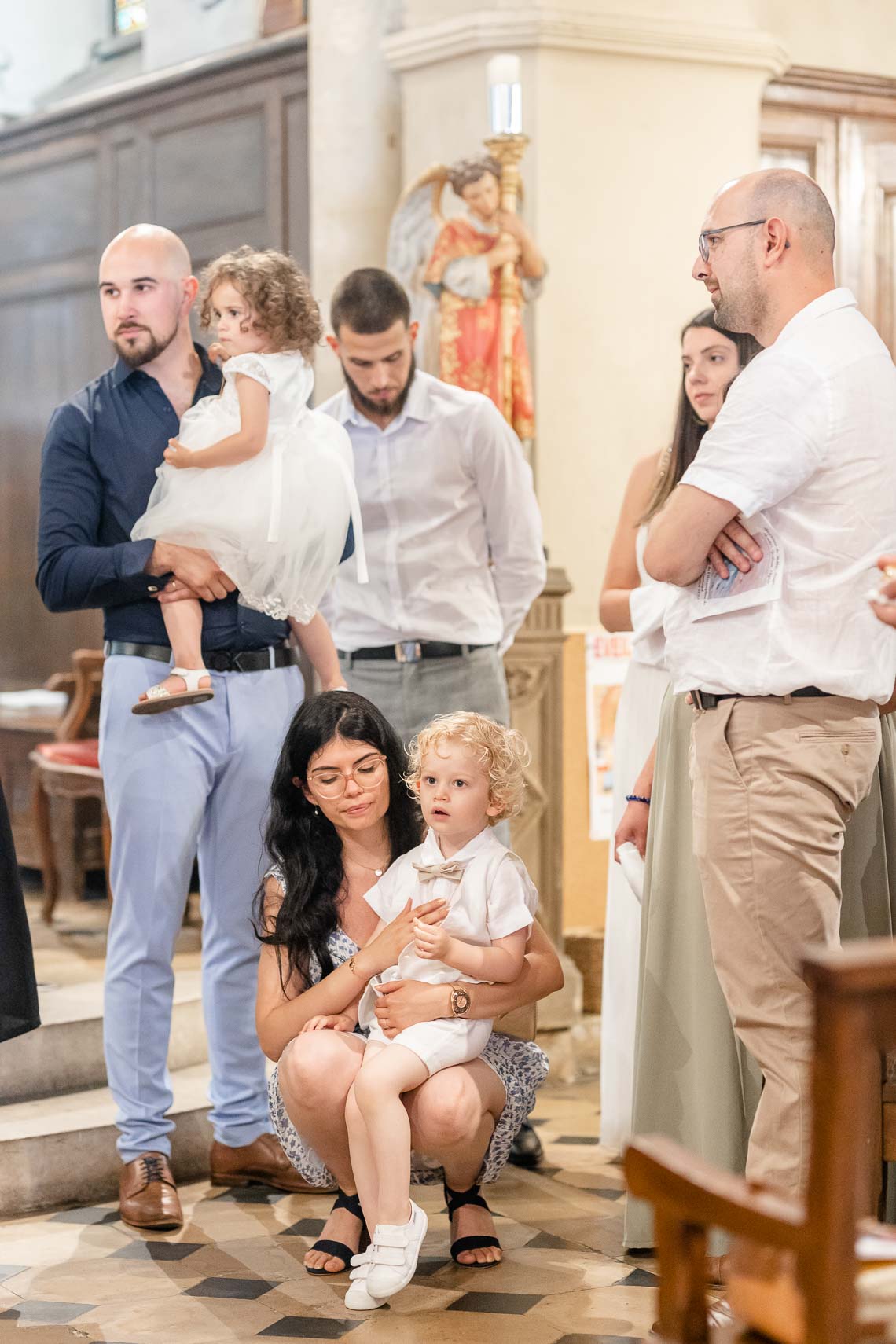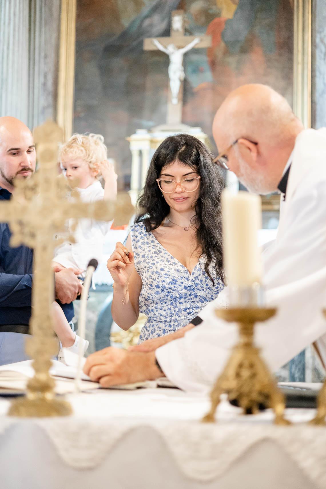 Après avoir réalisé des dizaines de reportages de baptême, je connais parfaitement tous les rituels de l’église. Cela m’aide à me placer où il faut au bon moment. Je peux donc, entre ces moments clés, réaliser des portraits à la volée des invités dans l’assemblée et notamment des enfants. Les enfants, surtout entre 1 et 3 ans, sont très curieux et s’amusent dans l’église. J’aime beaucoup les prendre en photo, notamment lors d’interactions avec des adultes. Le résultat est toujours mignon.